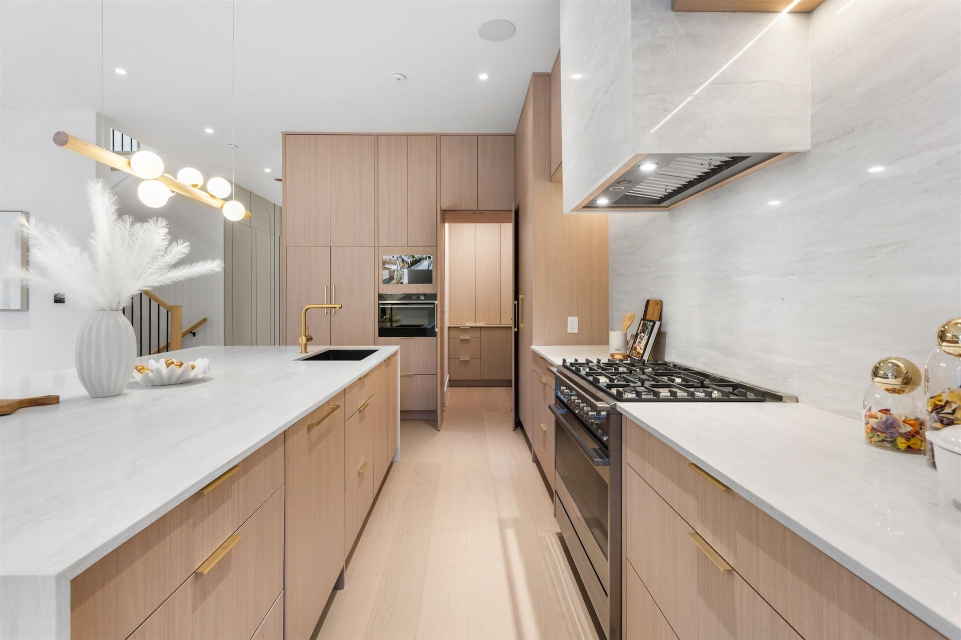 The interior living spaces balance everyday comfort with practical design. Integrated appliances and custom cabinetry anchor the kitchen, complemented by extended pantry space and abundant built-in storage throughout. Spacious bedrooms with private ensuites provide comfort and privacy. The addition of a recreation room and optional nanny suite below also adds flexibility to a variety of households.